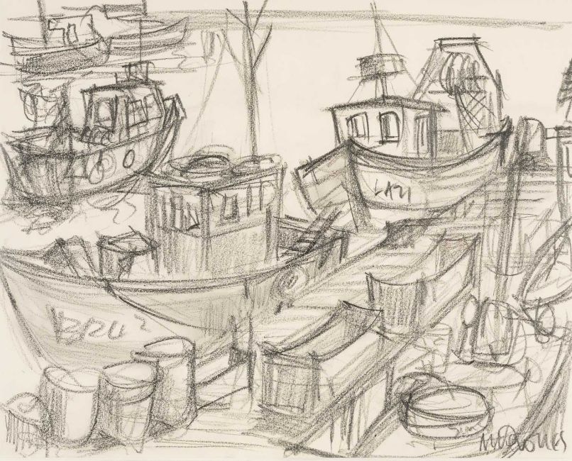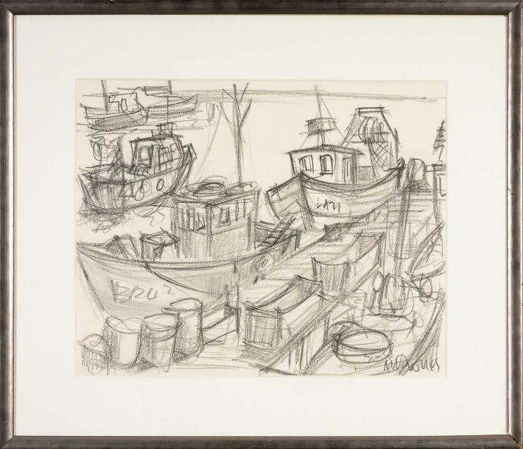 MIKE JONES (Welsh 1941-2022) graphite on paper - Swansea marina, entitled verso, 'Boats, Pocketts Wharf', signed, 41 x 51cms