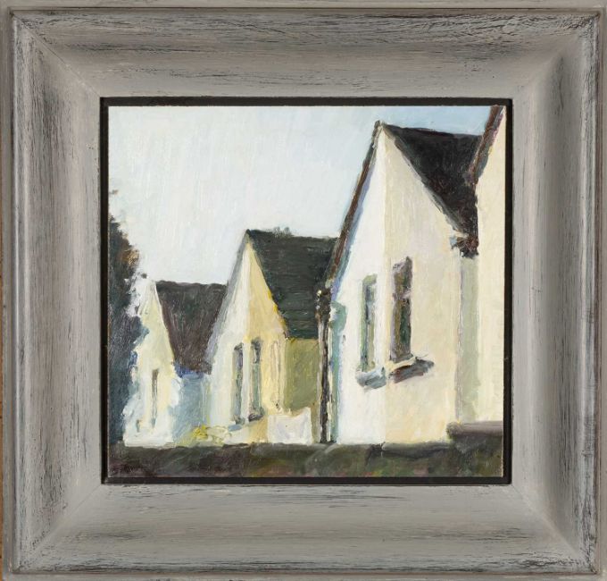 MARK SAMUEL (b.1956) oil on panel - Cardiff houses, entitled verso, 'Terrace, Canton' on Martin Tinney Gallery label, signed and dated verso 1997, 26 x 27cms