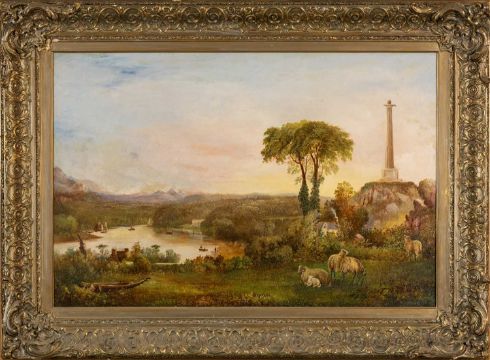 Auctioneer's Note: a rare view of Anglesey looking down the Menai Straits towards Caernarfon Bay from a point at Llanfairpwll in which the monument to The Marquess of Anglesey still stands proudly over 'Column Woods' at the upper-end of the village. Interestingly the painting shows the column before the bronze statue of the Marquess was added in 1860