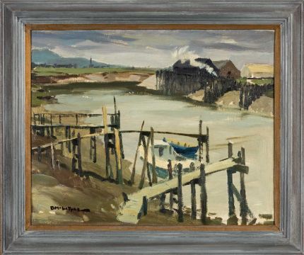 DONALD MCINTYRE (1923-2009) oil on board - entitled verso 'Grey Day, River Ely, Penarth' on South Wales Art Society label, fully signed, 40 x 49cms