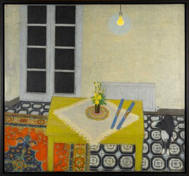 ERNEST ZOBOLE (Welsh 1927-1999) oil on canvas - standing dog gazing longingly at two packets of spaghetti on a table with daffodils, entitled 'In the Kitchen by the Window, No.1', circa 1978, 116 x 125cms