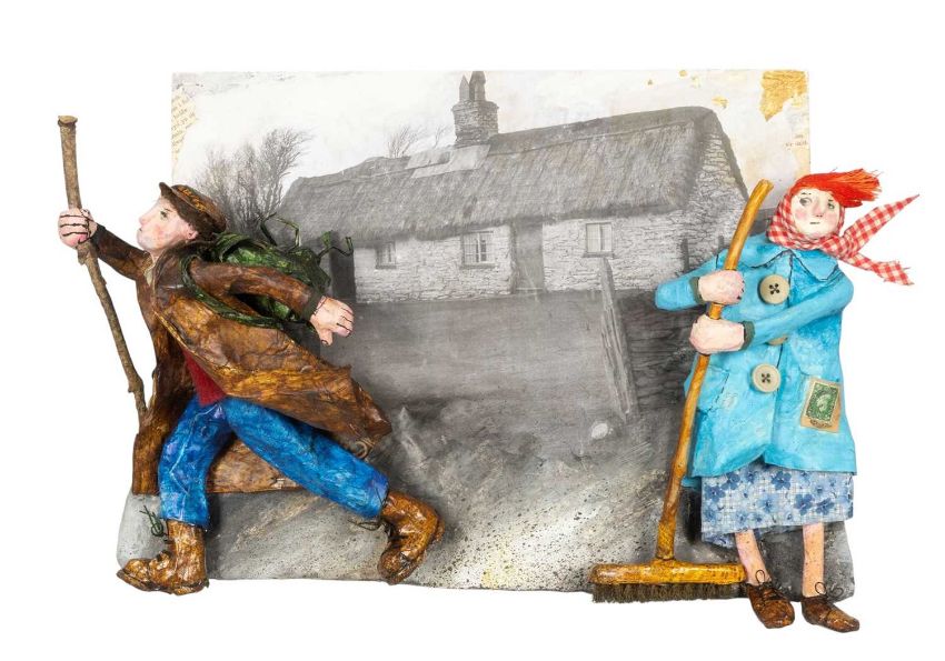 LUNED RHYS PARRI (Welsh b.1970) mixed media construction - two figures, one with walking stick and a lady with a broom, standing in front of a house, possibly at Capel Celyn, signed and dated verso 2022, glazed box frame size 50 x 70cm, depth 13.5cms