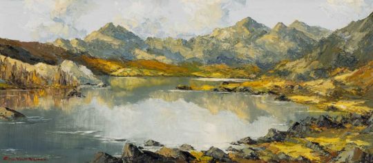 CHARLES WYATT WARREN (Welsh 1908-1993) oil on board - Eryri (Snowdonia) landscape with lake, possibly Llyn Mymbyr, signed, 24 x 54cms