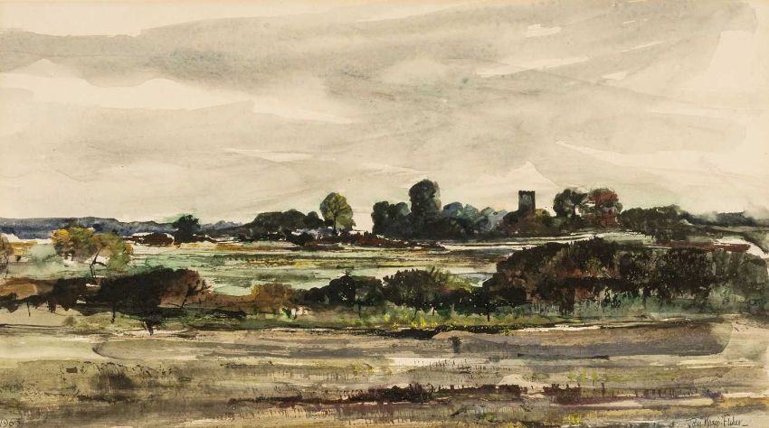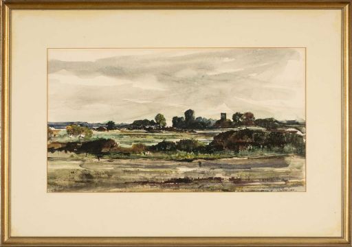 JOHN KNAPP-FISHER (1931-2015) early watercolour - believed Suffolk landscape with church tower, signed and dated 1963, 27.5 x 49cms