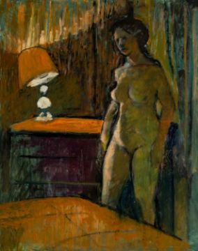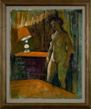 JOHN ELWYN (Welsh 1916-1997) oil on board - standing nude female, signed verso, 56 x 44cms
