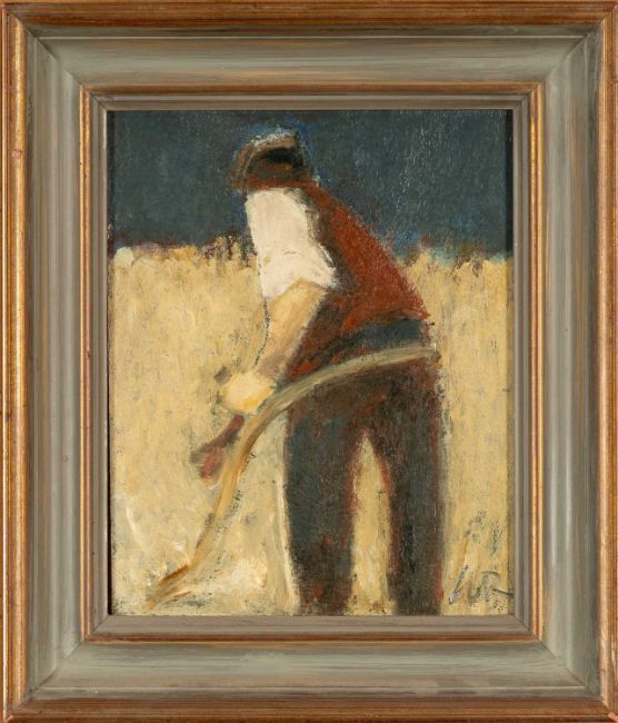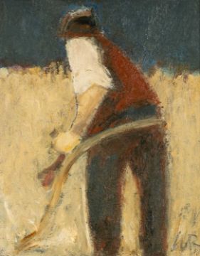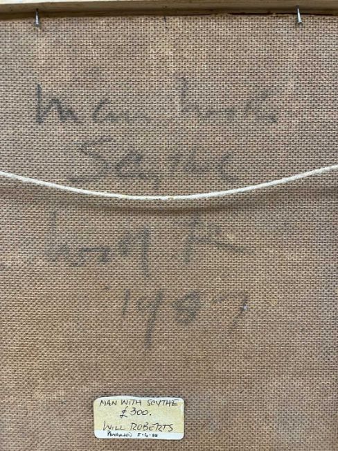 WILL ROBERTS (Welsh 1907-2000) oil on board - entitled verso, 'Man with Scythe', signed with initials, signed and dated 1987 verso, 25 x 20cms