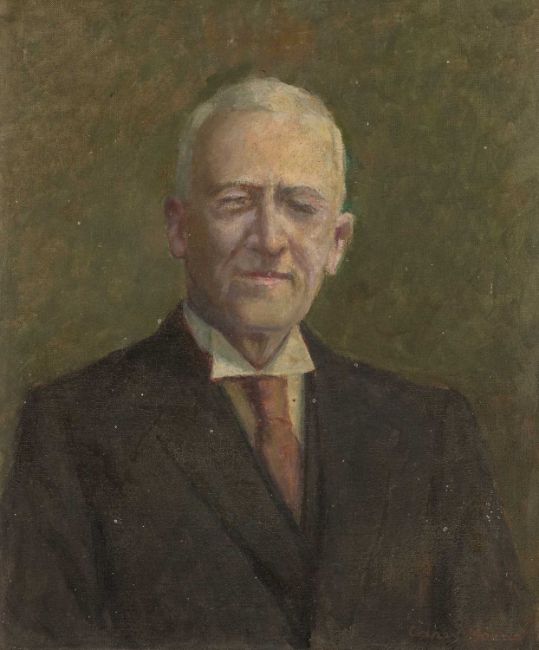 CAREY MORRIS (Welsh 1882-1968) oil on canvas - entitled verso on handwritten label with further details, 'Posthumous Portrait of Mr W. T. Jones, Llandeilo', signed, 59 x 49.5cms