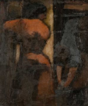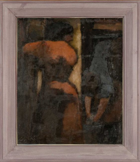 WILL ROBERTS (Welsh 1907-2000) oil on board - entitled verso, 'Charlady & Woman' on Albany Gallery label, signed and dated verso 1954, 60 x 50cms