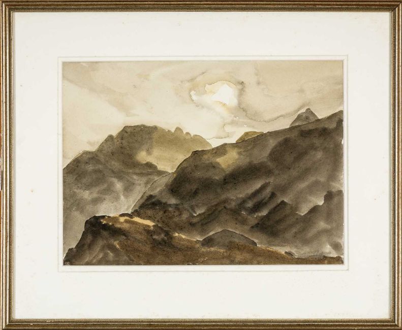 SIR KYFFIN WILLIAMS RA (Welsh 1918-2006) watercolour - entitled verso on label 'Sun above Crib Goch', signed with initials, 27 x 37.5cms