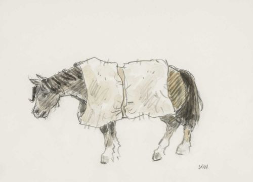 SIR KYFFIN WILLIAMS RA (Welsh 1918-2006) mixed media - a forlorn standing pony with rudimentary sack-cloth coat, signed with initials, 28 x 38cms