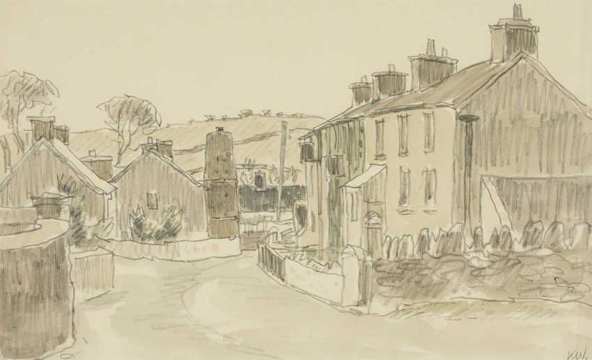 SIR KYFFIN WILLIAMS RA (Welsh 1918-2006) watercolour - North Wales village with silo, signed with initials in pencil, 27 x 44cms
