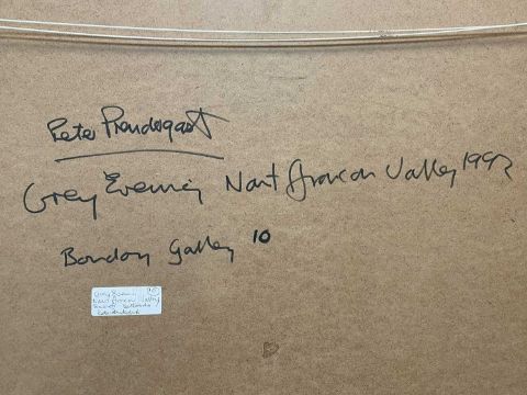 PETER PRENDERGAST (Welsh 1946-2007) acrylic on paper - entitled verso, 'Grey Evening, Nant Ffrancon Valley, Towards Bethesda', signed and dated '92, 87 x 118cms