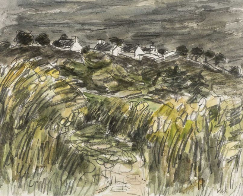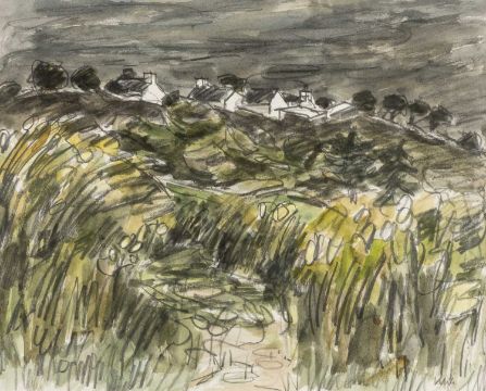 SIR KYFFIN WILLIAMS RA (Welsh 1918-2006) watercolour - the village of Llanddona, Anglesey, signed with initials, 39 x 48cms