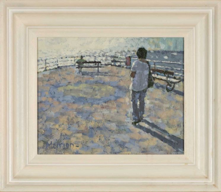 MEIRION JONES (Welsh b.1966) oil on board - figures at Aberystwyth pier, signed, 21.5 x 27cms