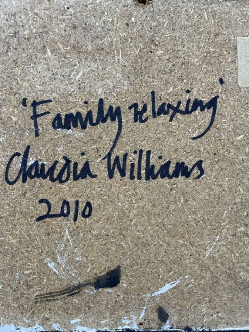 CLAUDIA WILLIAMS (1933-2024) oil on panel - entitled verso, 'Family Relaxing', signed with initials, signed and dated verso 2010, 27 x 27cms