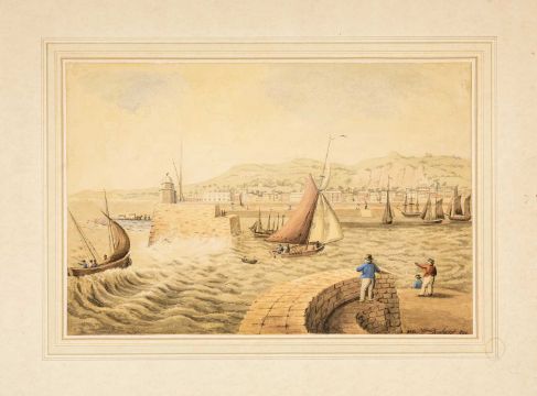 WYNFORD DEWHURST (1864-1941) watercolour - historical view of Swansea with shipping and figures, entitled 'Swansea Harbour', signed and dated 1844, 31 x 46cms