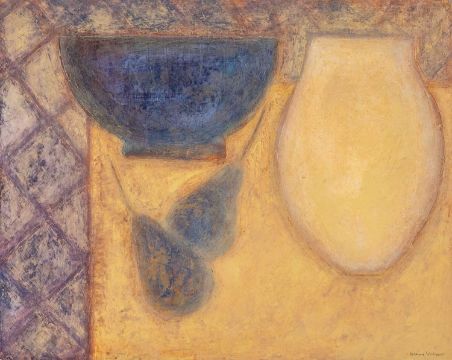 VIVIENNE WILLIAMS (Welsh b.1955) mixed media - entitled verso, 'Cream Pot with Blue Bowl & Pears' on Martin Tinney Gallery label, signed, dated verso 1999, 40.5 x 50.5cms