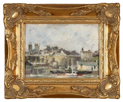 WILLIAM SELWYN (Welsh b.1933) early oil on board - entitled verso, 'Caernarfon from the Harbour', signed with initials, 14 x 19cms