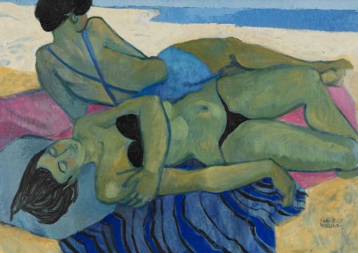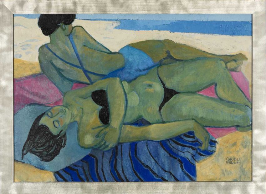 CLAUDIA WILLIAMS (1933-2024) oil on canvas - entitled verso, 'Two Bathers in the Shade' on Martin Tinney Gallery label, signed, dated verso 1996, 45 x 64cms