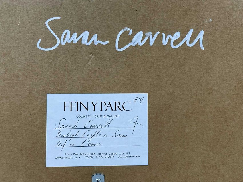 SARAH CARVELL (Welsh b.1964) oil on canvas - entitled verso, 'Denbigh Castle in the Snow' on Ffin-y-Parc Gallery label, signed with initials, fully signed verso, 28 x 38cms