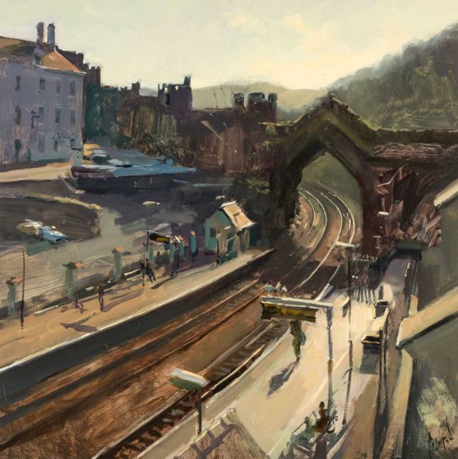ROB POINTON (b.1982) oil on board - entitled verso, 'Sun on the Tracks, Conwy Station' on Ffin-y-Parc Gallery label, signed, 39 x 39cms