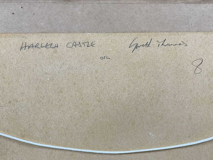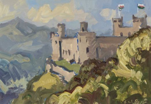 GARETH THOMAS (Welsh 1955-2019) oil on board - entitled verso, 'Harlech Castle', with two Welsh flags flying, signed, 16 x 23cms