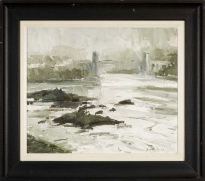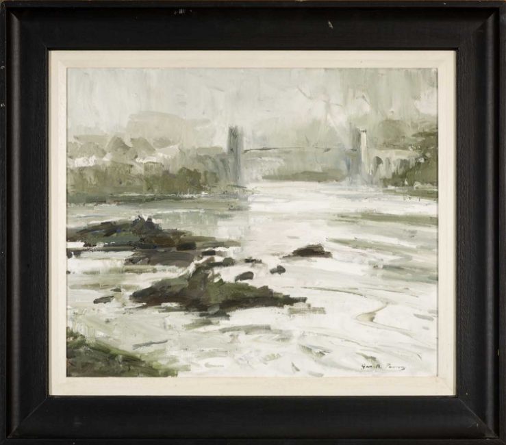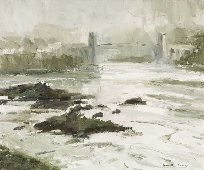 GARETH PARRY (Welsh b.1951) oil on canvas - entitled verso, 'Glawio'n Dawel Ar Y Fenai / Raining Gently on the Menai', signed, 49.5 x 60cms