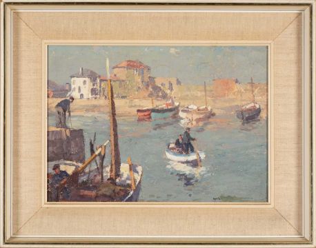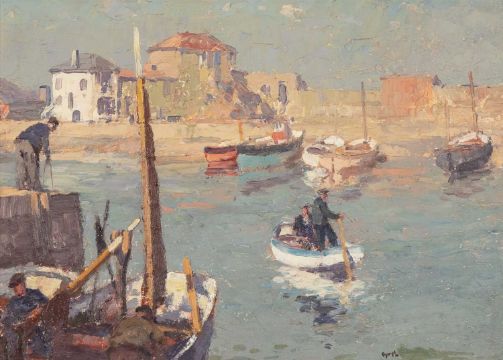 GYRTH RUSSELL (1892-1970) oil on board - fine example, entitled verso, 'Sunlit Mevagissey' on Society of Marine Artists label, signed, 30 x 42cms