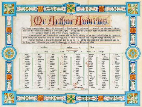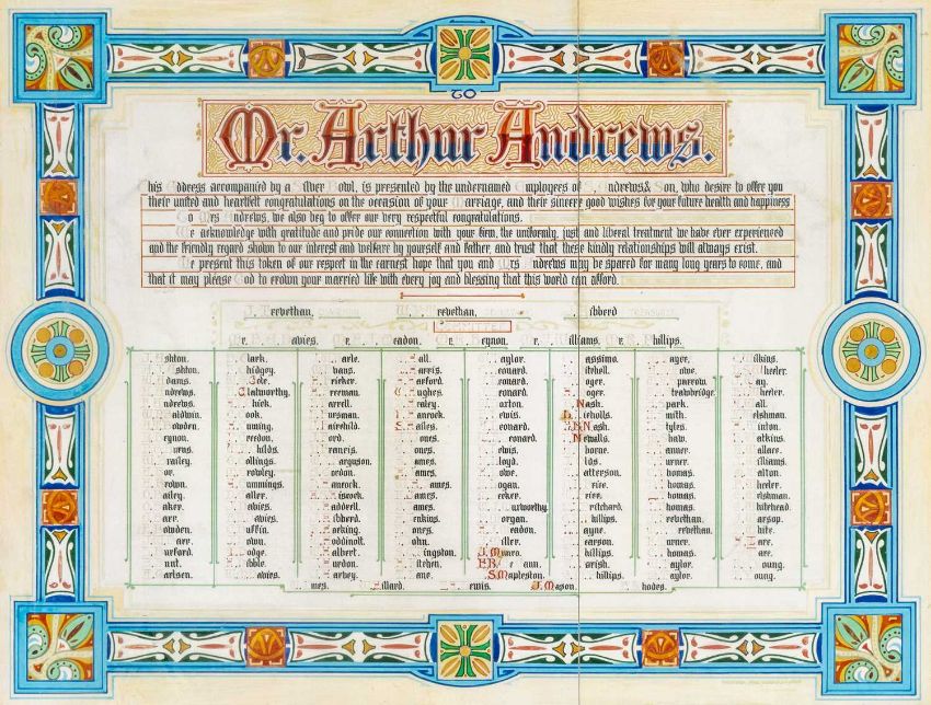 LATE VICTORIAN ILLUMINATED MANUSCRIPT named to Francis Emile Andrews on the occasion of his marriage, presented by The Employees of S. Andrews & Son with list of employees within elaborately decorated border dated February 1884, 52 x 38cms; facsimile of similar marriage dedication to Arthur Andrews; framed miniature portrait of the Andrews family members; institute of Motor Trade certificate to Walter Andrews; electroplated oak mounted tea tray to Walter Andrews; initialled leather writing wallet presented to Walter Andrews with greeting cards etc. and an oak hour glass belonging to Alice Jane (wife of F.E. Andrews)