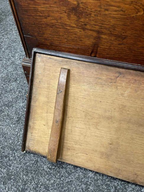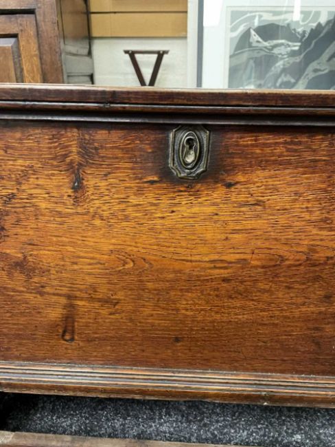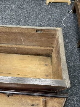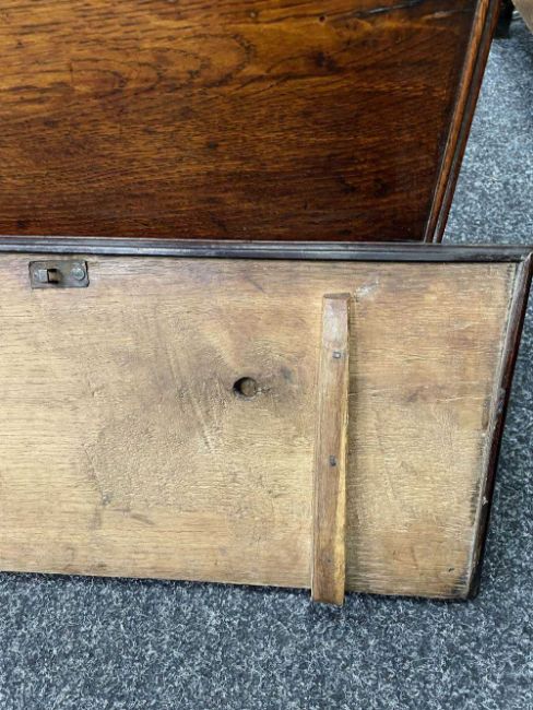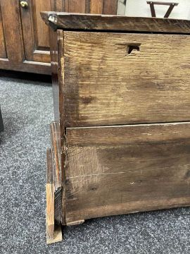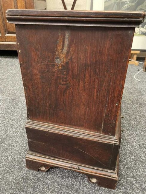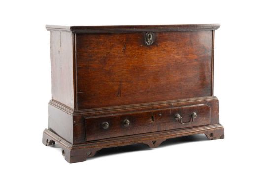 18TH CENTURY WELSH BOARDED OAK COFFOR BACH, possibly Carmarthenshire, detachable moulded lid with strut hinge, iron lock, the apron drawer indistinctly inscribed in pencil 'xxx, By John Davies xxx', on pierced bracket feet with central Welsh heart motif, 45 (h) x 59 (w) x 28cms (d)