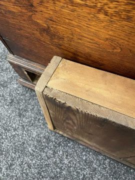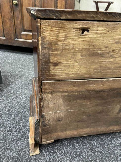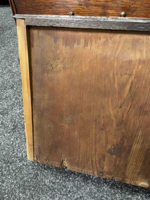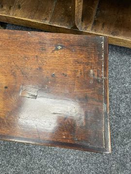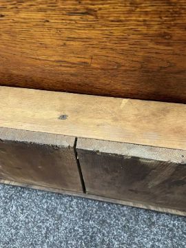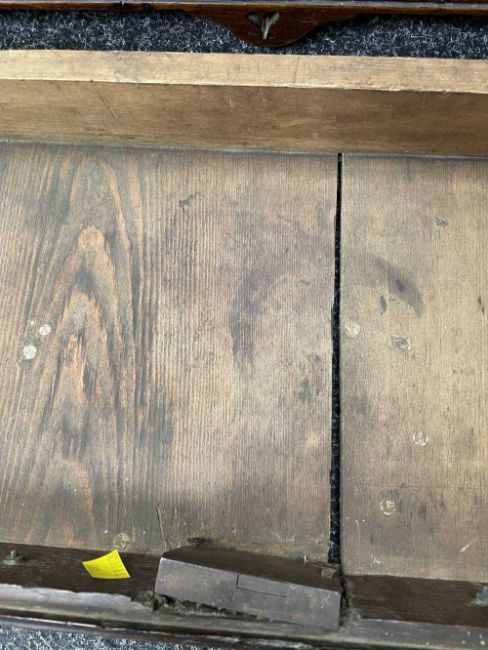 Comments: top with water stain & repair to knot, crude repair to damaged foot (right-rear), old worm, inspection advised