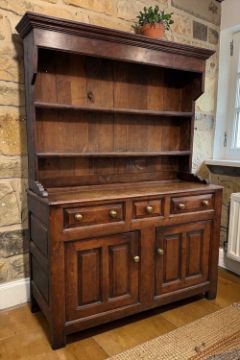 Comments: later plate batons, brass handles later/replaced, feet with old water damage and later stained, old worm, back feet with strengthening brackets, plate rack with old paint to sides, inspection advised