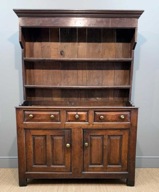 18TH CENTURY WELSH OAK DRESSER OF SMALL PROPORTIONS, Caernarfonshire, boarded half-canopy rack, shaped shoes on cupboard base, fitted with fielded panelled drawers and cupboards, stile feet, 193 (h) x 139 (w) x 50cms (d)