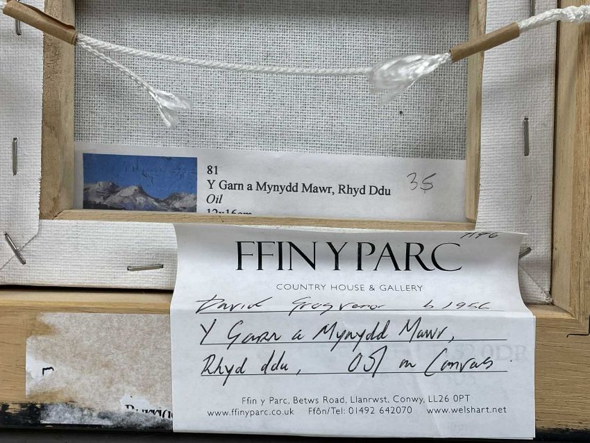 DAVID GROSVENOR (b.1956) oil on canvas - entitled verso, 'Y Garn a Mynydd Mawr, Rhyd Ddu' on Ffin-y-Parc Gallery label, signed, 12 x 17cms