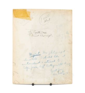 Provenance: Collection of renown Welsh architect Dewi Prys-Thomas (1916-1985) who acquired the photograph from America in the 1980s as Frank Lloyd Wright was one of his heroes. Dewi-Prys Thomas was the first professor of architecture at the University of Wales and was also the head of the Welsh School of Architecture, where he instituted a new Department of Town Planning. He designed a number of prominent buildings in a distinguished career. From 2003 to 2015, the Dewi-Prys Thomas Trust awarded a prestigious triennial prize, recognising the importance of good design to the quality of life, identity and regeneration of Wales. From 2023 until this present day, in conjunction with the RSAW (The Royal Society of Architects in Wales), 'The Dewi-Prys Thomas Award' has been given annually to reward projects of excellence across fields of design and public art and architecture.