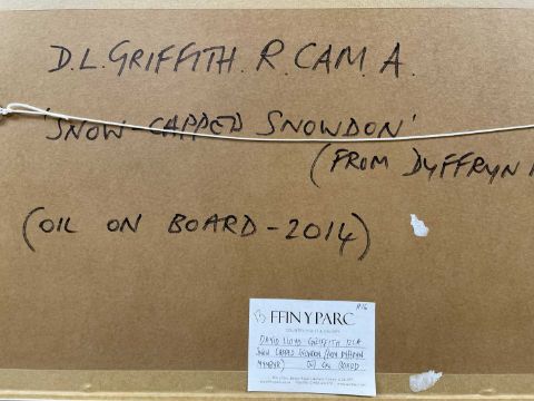 DAVID LLOYD GRIFFITHS (Welsh b.1956) oil on board - entitled verso, 'Snow-capped Snowdon from Dyffryn Mymbyr' on Ffin-y-Parc Gallery label, signed, 18 x 42cms