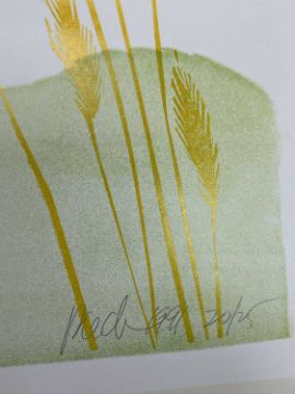 PAUL PETER PIECH (American, lived / worked Wales, 1920-1996) limited edition (20/25) woodcut print - quote from Japanese poet Mokudô entitled, 'Wheat Field', signed and dated 1991, 45 x 64cms