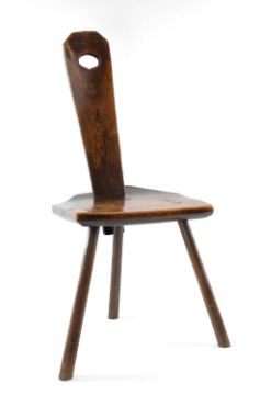 Auctioneer's Notes: see Rogers Jones' Welsh Sale, 27.4.24, lot 65 for a stool with thick circular seat from the Pat Llewellyn collection. Cf. Richard Bebb, 'Welsh Furniture 1250-1950', vol 2, p. 47, no 683 for another backstool from Bedlinog, Glamorgan. Also cf. Victor Chinnery, 'Oak Furniture: The British Tradition', p. 55, fig. 2:46, for a backstool in the Hereford City Museum and Art Gallery collection, explanatory text noting "the first and most simple development from the primary stool, here with a single narrow vertical board acting as a backrest. An extremely rare type, but commonly plagiarised in reproductions and referred to as a 'spinning-chair' ".