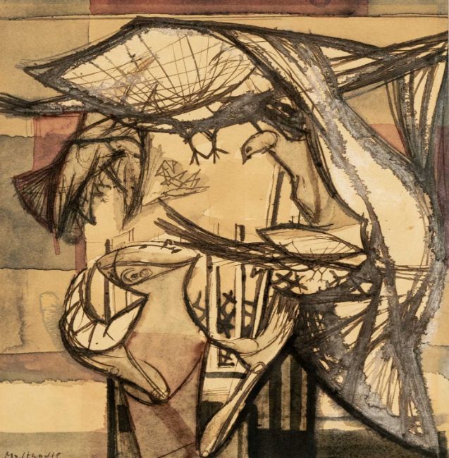 ERIC MALTHOUSE (1914-1997) ink and watercolour - figure standing under a kitte of pigeons, signed, 15.5 x 15.5cms