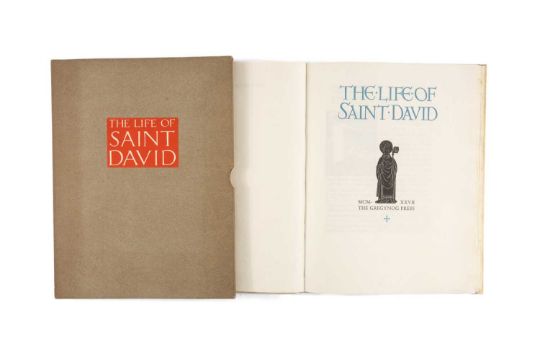 GWASG GREGYNOG PRESS: THE LIFE OF SAINT DAVID 1927 limited edition (71/175) the foregoing text, freely collated by Ernest Rhys is based upon the Latin Life by Rhygyfarch (1057-1099) & upon the later Lives, the earlier English versions have been compared with those of modern scholars, notably the Rev. A. W. Wade Evans, Chancellor Fisher and the late professor Lewis Jones whose pages have been incorporated in some salient episodes of St. David's Life as here printed and whose aid is most gratefully acknowledged, the division into chapters is made for the first time in this Gregynog volume, printed by Robert Ashwin Maynard and completed in September 1927, the decorations were designed and engraved on wood by Horace Walter Bray and coloured by hand at Gregynog, by the courtesy of the Dean, the picture of St. David on the title page was drawn from a brass, dated 1476 in Hereford Cathedral, Compositor, Richard Owen Jones, Pressman, John Hugh Jones and Herbert John Hodgson, the chapter openings, initial letters and paragraph marks are all drawn with a quill by Bray.