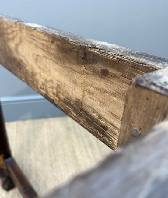 Comments: good colour, tabletop with splits and stains, old worm (notably to one leg), tabletop not fixed to frame, inspection advised