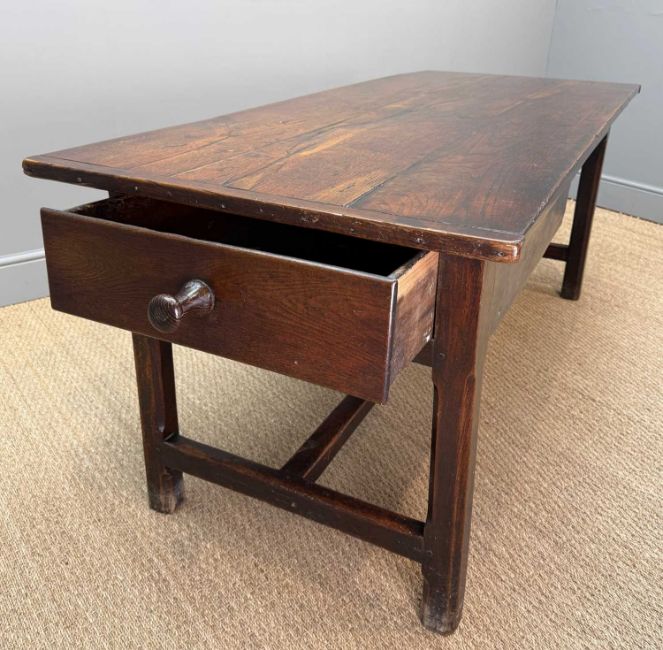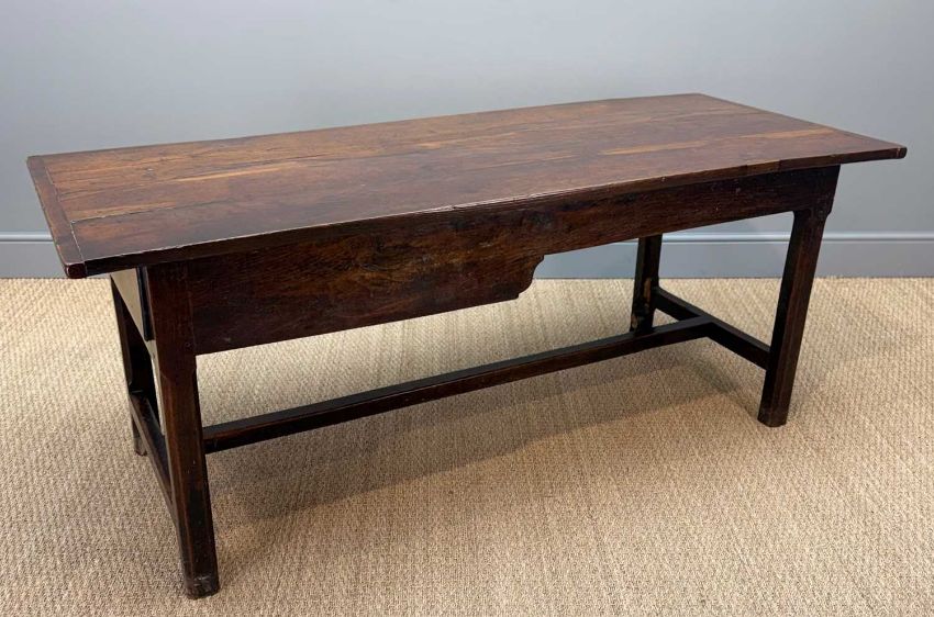 Auctioneer's Note: compare with a similar table, p.54, no.702, Richard Bebb, Welsh Furniture 1250-1950, vol 2, where it states, "the cegin contained a long table, invariably strongly made and of joined construction, normally with square chamfered legs with H-shaped or simple end stretchers. Placed beneath the window (where there was often a fixed seat) to obtain the benefit of the light, these were for worksurfaces as well as dining, and often had tops which were reversible leaving an unpolished surface for tasks such as food preparation, laundry and occasional tailoring."