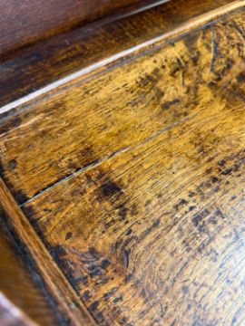 Comments: stained plate rack backboard later adaptation, base top slightly warped, shrinkage splits, turned drawer handles and locks appear to be original, overall good colour, normal stains, scratches and signs of use, old worm, one drawer with remains of polythene liner, inspection advised