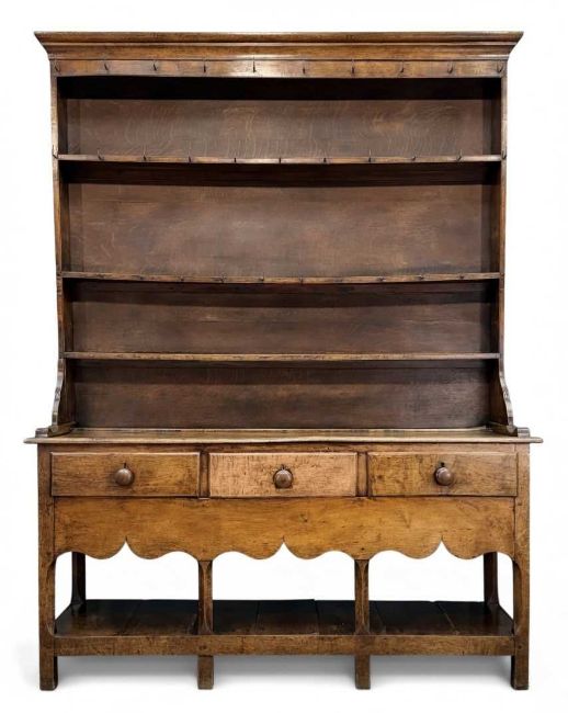 Auctioneer's Note: compare with lot 7, Rogers Jones & Co. Welsh Sale 16.11.24, for an early 18th C. five-drawer Towy valley dresser with similar legs published in Richard Bebb, Welsh Furniture 1250-1950, vol II, pp.132-133, and fig 891: "Many of the dressers in the south from the middle of the (18th) century bore a resemblance to those from mid-Wales, such as an example from the Towy valley which had a base with a double row of drawers and deep ogee-shaped apron which was raised clear of the ground by tall bracket feet."
