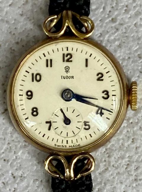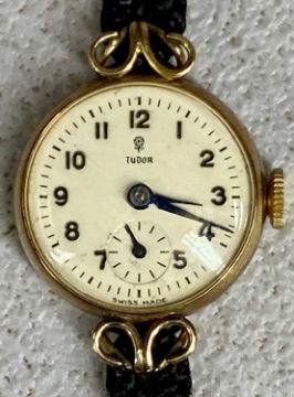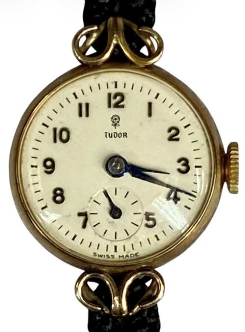 VINTAGE TUDOR 9CT GOLD-CASED LADIES' WRISTWATCH, cream dial with raised Arabic numerals and subsidiary seconds dial, 20mms (diam.) case, on woven strap with rolled gold clasp