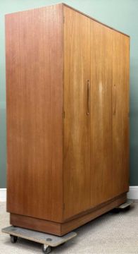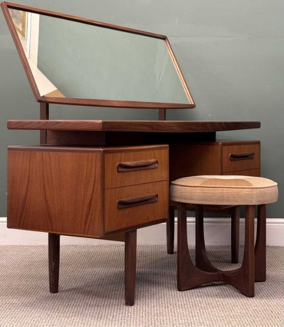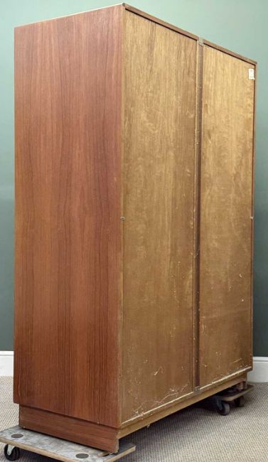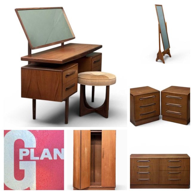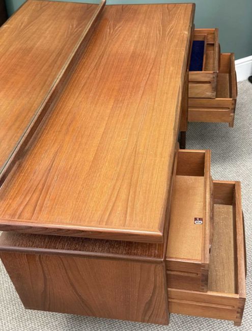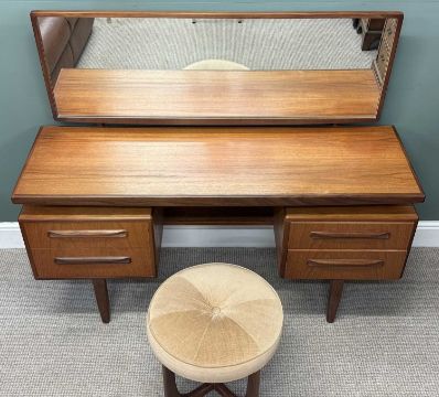 G PLAN TEAK BEDROOM SUITE, comprising triple wardrobe, 176 (h) x 122 (w) x 59cms (d); dressing table chest, 122 (h) x 135 (w) x 46cms (d); eight-drawer chest, 73 (h) x 140 (w) x 45cms (d); and two narrow three-drawer chests, 52 (h) x 48 (w) x 45cms (d); together with a cheval mirror and stool (7)