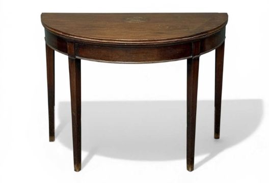 19TH CENTURY MAHOGANY DEMI-LUNE CARD TABLE, fold-over top with lined interior, on tapered square supports, 74 (h) x 100cms (diam.)