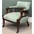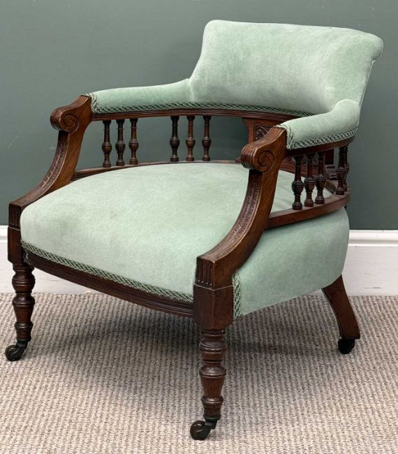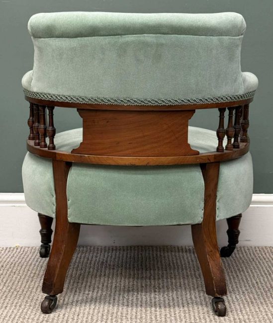 EDWARDIAN UPHOLSTERED TUB CHAIR, spindle and upholstered back, on turned supports with castors, 65 (h) x 58 (w) x 56cms (d)
