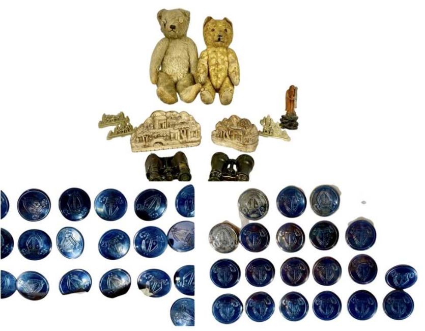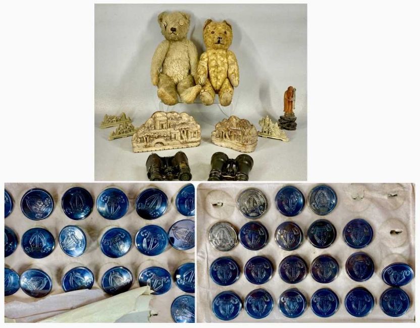 VINTAGE COLLECTABLES, including two small mohair straw-filled teddy bears, set of Tipson & Newby white metal buttons, soapstone carvings, two pairs of opera glasses, etc.