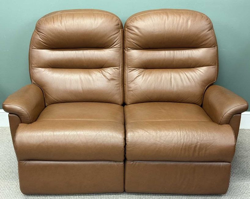 MODERN THREE-PIECE MANUAL RECLINING SUITE in tan coloured upholstery, comprising two-seater sofa, 105 (h) x 152 (w) x 100cms (d); and a pair of armchairs (3)